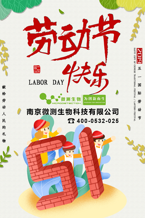 南京微測生物科技有限公司祝新老客戶(hù)朋友五一勞動(dòng)節快樂(lè )!友情提示:2019年5月1日起至2019年5月4日放假,共計4天,放假期間不發(fā)貨,5月5日上班恢復正常發(fā)貨。