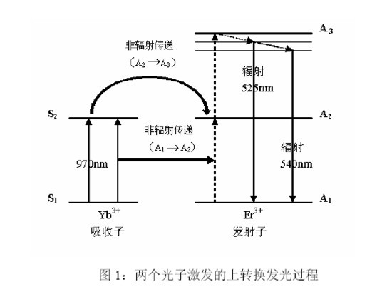 自然界中存在很多有機或無(wú)機物質(zhì),它們可以在電磁輻射激發(fā)下發(fā)射熒光或磷光,且在發(fā)光過(guò)程中遵守Stokes 規則,即發(fā)射光的波長(cháng)長(cháng)于激發(fā)光的波長(cháng)。而在20 世紀70 年代,科學(xué)家們卻合成了一類(lèi)可以反Stokes 規則產(chǎn)生磷光的特殊材料,即UCP。UCP 在紅外光區(波長(cháng)>780nm)被激發(fā),卻可以發(fā)射波長(cháng)遠短于激發(fā)光的可見(jiàn)光(波長(cháng)475nm-670nm),即能量上轉換。物質(zhì)構成決定性質(zhì)特點(diǎn)。UCP 是由稀土金屬元素摻雜于晶體的晶格中構成的。在這種材料中有三種主要的成分:主基質(zhì)(Host Matrix)、吸收子(Absorber)和發(fā)射子(Emitter)。作為主基質(zhì)的晶體材料有:氧硫化物(如Y2O2S、GdO2S、La2O2S 等)、氟化物(如YF3、GdF3、LaF3 等)、鎵酸鹽(如YGaO3、Y3Ga5O12 等)以及硅酸鹽(如YSi2O5、YSi3O7 等)等;常用作吸收子的稀土金屬離子有:鐿離子(Yb3+)、鉺離子(Er3+)、釤離子(Sm3+)等;常用作發(fā)射子的稀土金屬離子有:鉺離子(Er3+)、鈥離子(Ho3+)、銩離子(Tm3+)、鋱離子(Tb3+)等。吸收子和發(fā)射子這一離子對在主基質(zhì)晶格內適宜的空間取向和距離,是產(chǎn)生上轉換發(fā)光的基礎。上轉換發(fā)光的產(chǎn)生是一個(gè)涉及多個(gè)(至少兩個(gè))光子的光學(xué)過(guò)程。在這個(gè)過(guò)程中(如圖1),UCP 內的吸收子(如Yb3+)至少要吸收兩個(gè)低能量光子(紅外光區,如970nm),而后經(jīng)過(guò)一系列內部能量轉換,以非輻射的形式(A1→A2,A2→A3)將這兩個(gè)光子的能量連續傳遞給發(fā)射子(如Er3+),以使其處于激發(fā)態(tài)(A3)。后者接著(zhù)發(fā)生一個(gè)返回基態(tài)能級的躍遷,釋放一個(gè)高能光子(可見(jiàn)光區,如525nm 或540nm),完成能量上轉換。